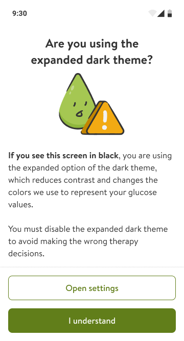 If you see a warning card in your app and you're seeing the screen in black, it’s because you have turned on the Expanded Dark Theme in your system settings.