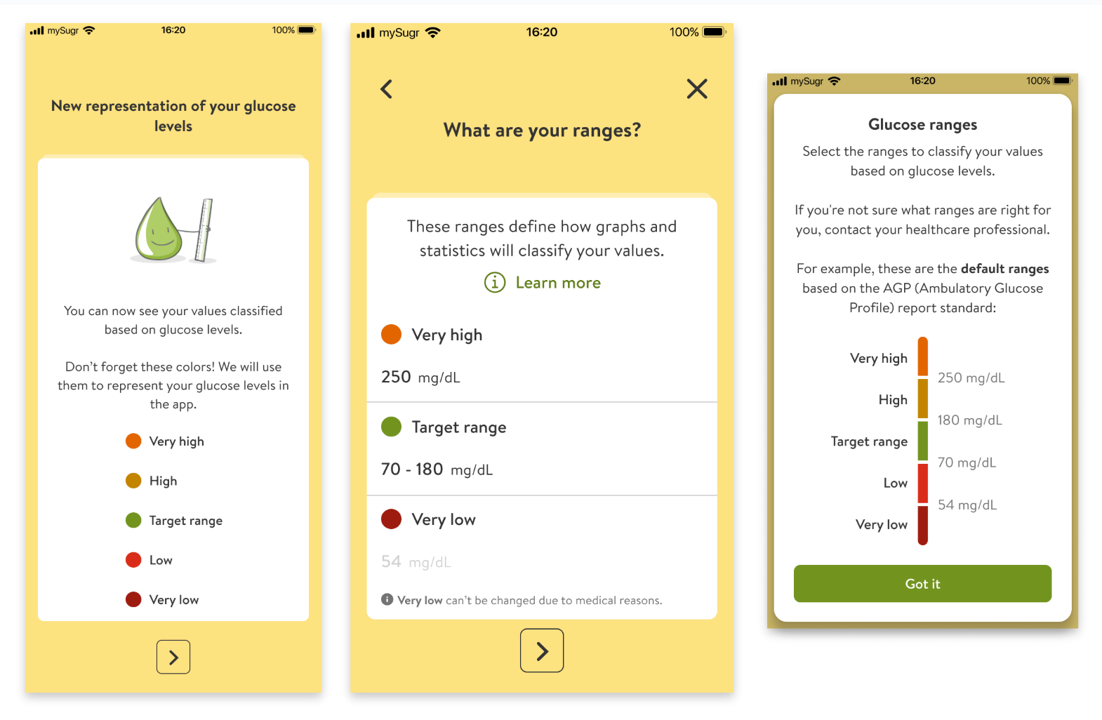 正しい設定画面が表示されたら、「グルコースの範囲」設定を変更するオプションが表示されるまで下にスクロールします。グルコース範囲の設定によって、アプリ内でのAGPカラーで表示される数値の色が変わります。