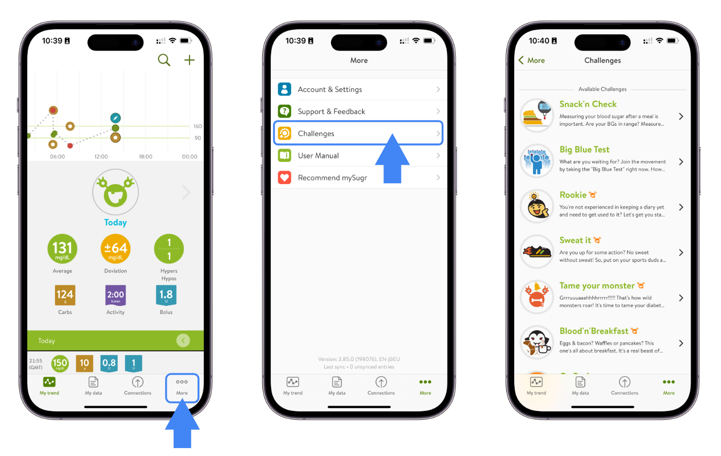 Välj sedan den utmaning som verkar roligast för dig. Vi rekommenderar att man börjar med utmaningen ”Rookie”, eftersom den är snabb och enkel och hjälper dig att bekanta dig med mySugr appen på ett kick!🫰